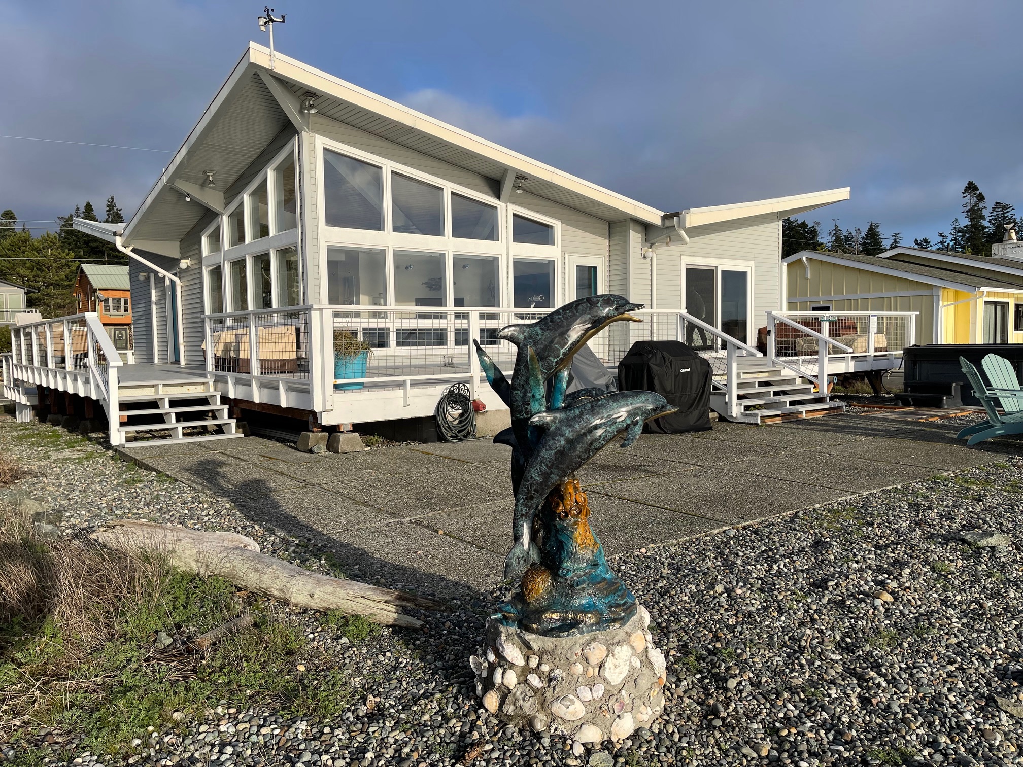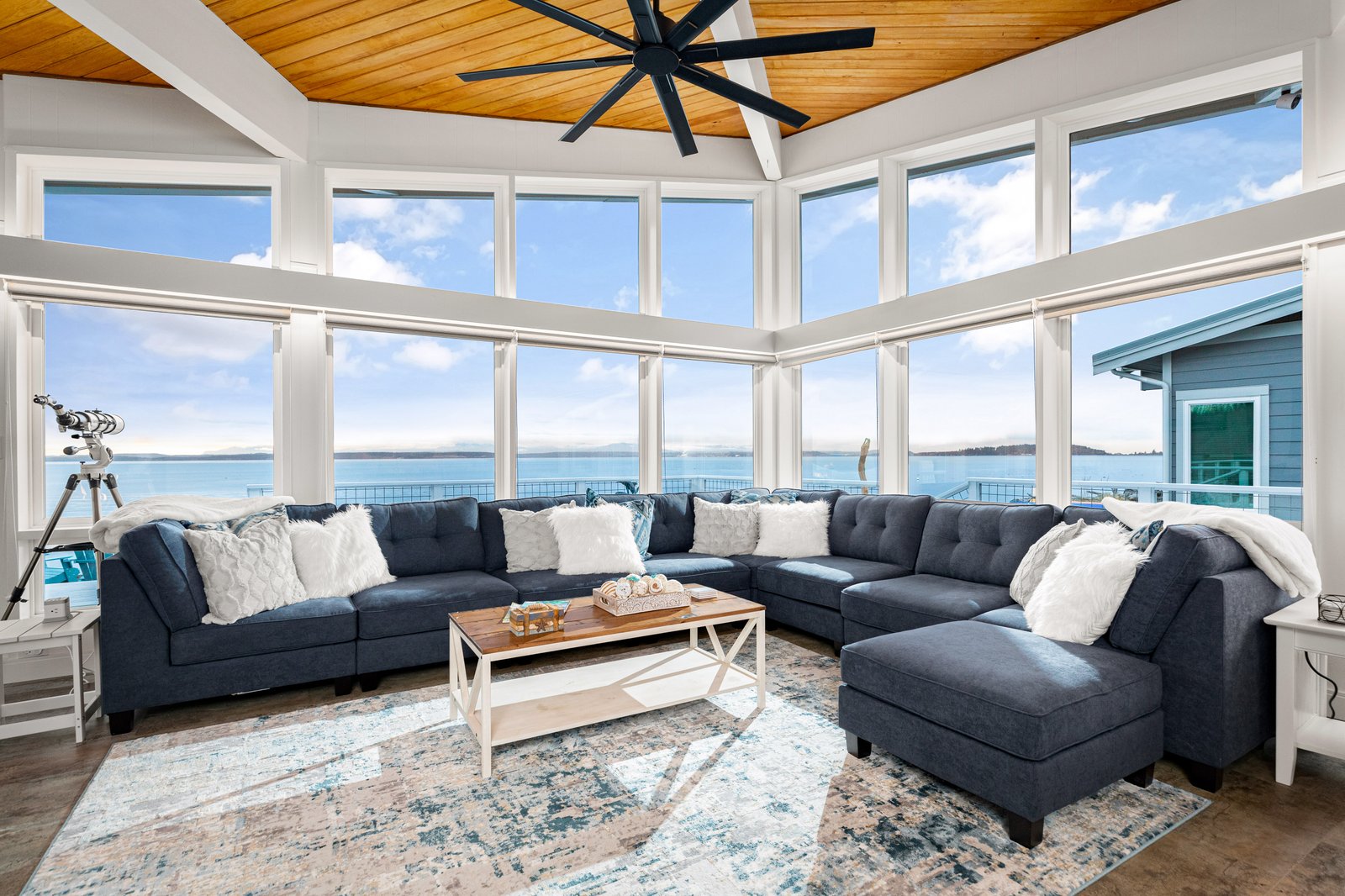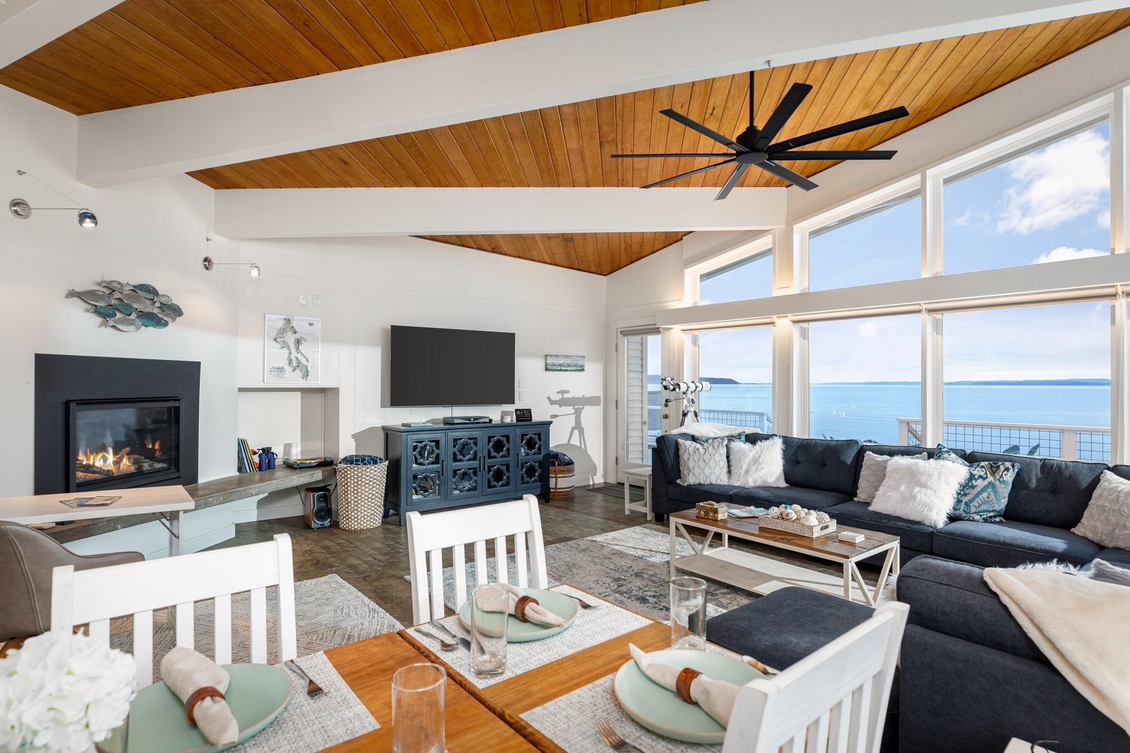 A stunning Beachfront Paradise! This architectural mid-century modern home sleeps 8+ with vaulted ceilings offering panoramic views of the Ocean, Olympics, Cityscapes, Coupeville Ferry, marine traffic and all the wildlife you can imagine!