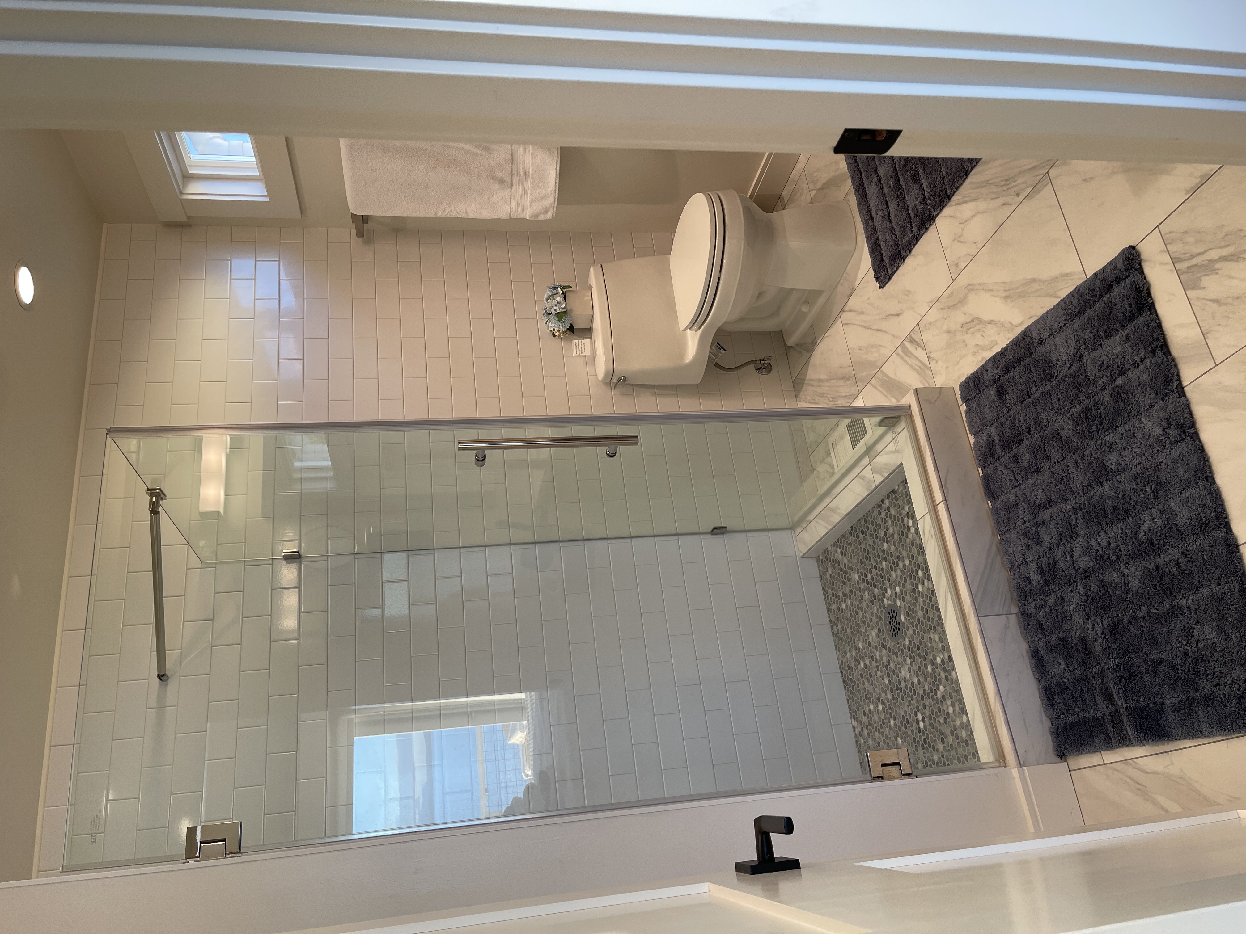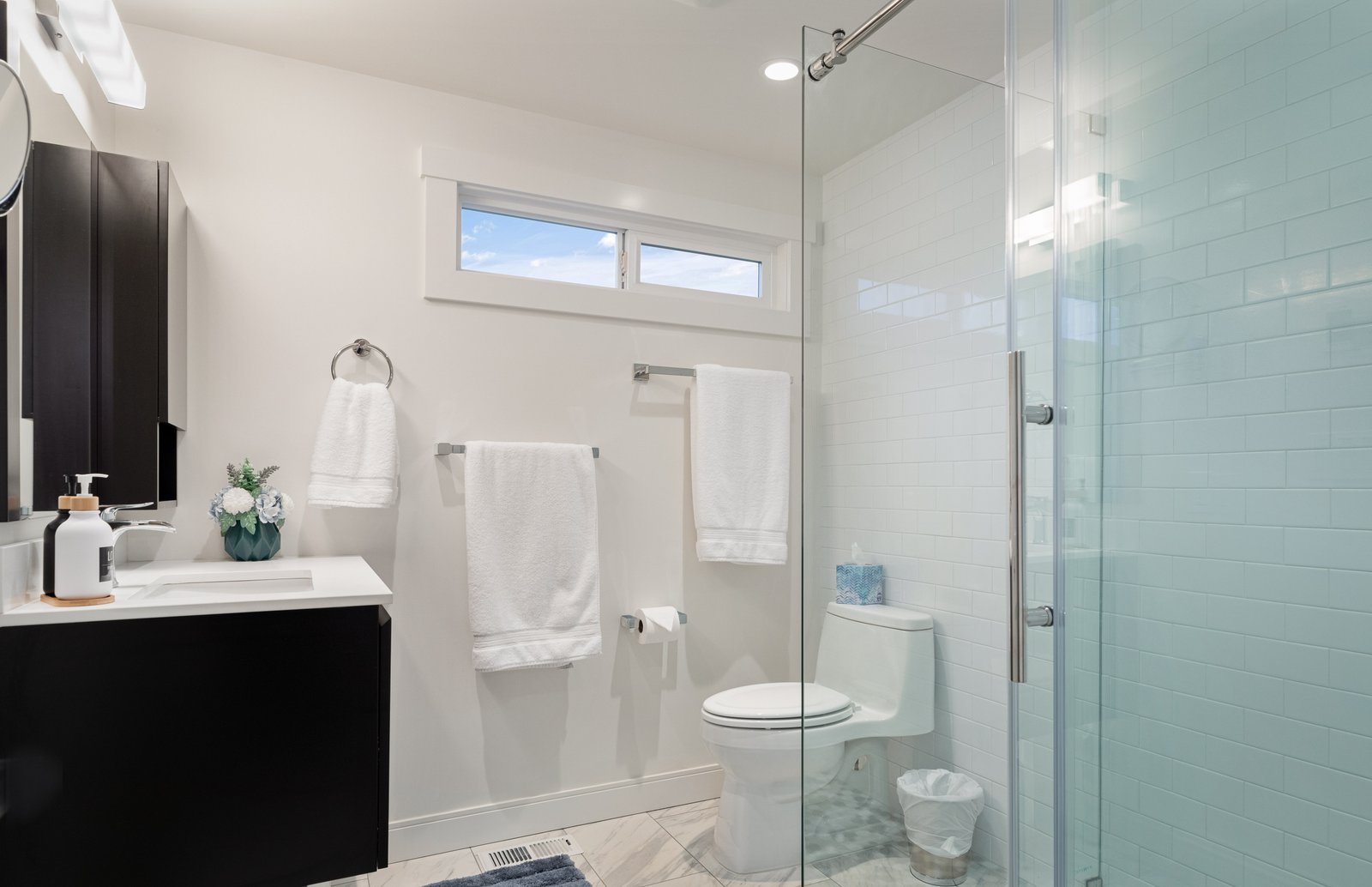 Read MoreA spa like space with heated floors, tile and glass shower including shampoo, conditioner, body wash; floating sink cabinet with hand soap and body lotion. Tissues and toilet paper. Wall mounted make up mirror, hair dryer and curling iron. Spa towels!