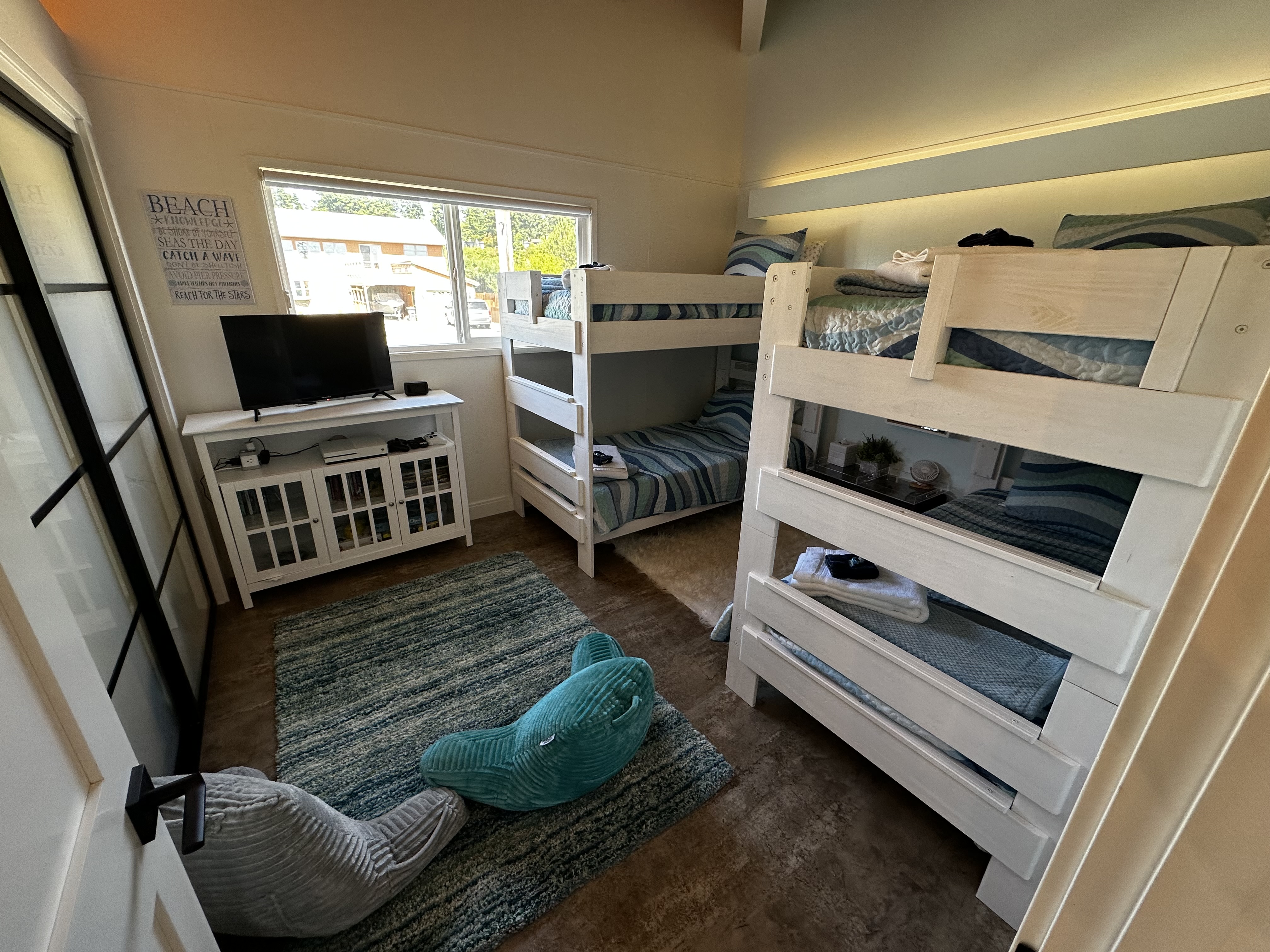 Read MoreKids will delight in spending time in this fun filled room with NEW STURDY WOOD double bunk beds with XL Memory Foam mattresses and colorful bedding. Filled with games, books and toys for all ages, here you will find an XBox 1S with 2 controllers and 11 games. A 32" Smart TV w/Roku. Snuggle up with comfy pillow game chairs. Two queen auto inflating beds (either in closet or under bunk beds), hangers, luggage rack and extra bedding. Room darkening shades! Pack and play with bassinet and sheets in closet. This room works great for a girl’s weekend too!