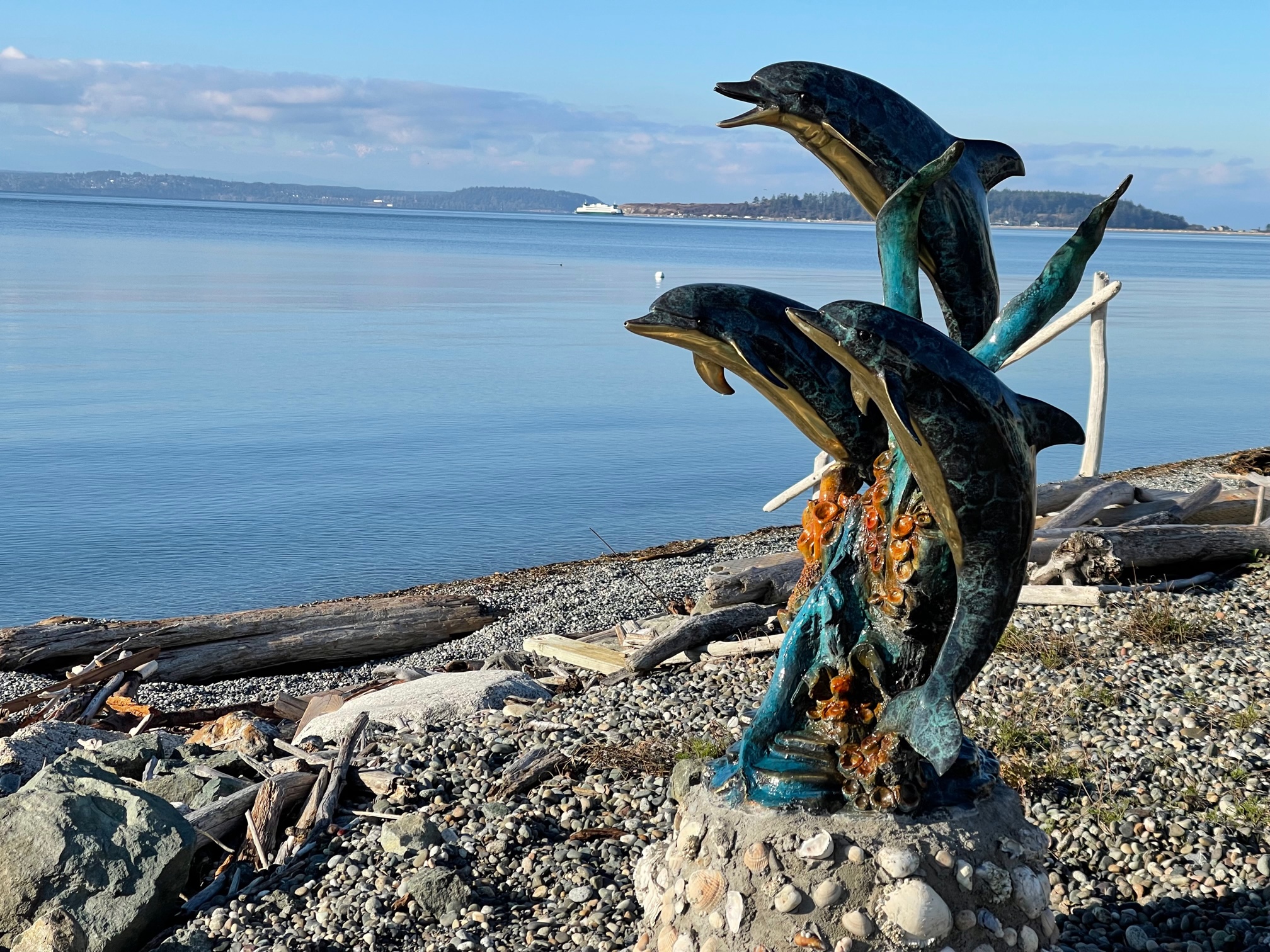 The background reveals a different dimension of beauty, as a ferry navigates through the waters. Its imposing silhouette against the horizon symbolizes human progress and our ongoing connection to the sea.