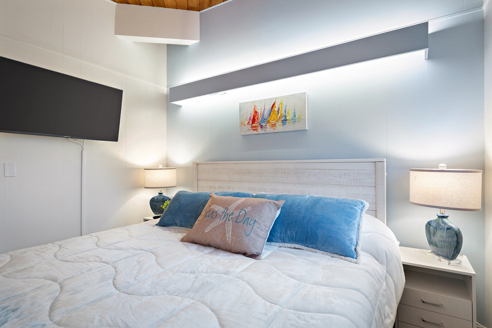 Read MoreWander down the hall to your left into the first guest room with a King Size Luxury Dream Cloud mattress and plush bedding. 44" Smart HDTV w/Roku. Matching night stands equipped with charging stations, travel power adapter and extra charging capabilities. Room darkening shades. The closet contains bedding for two queen inflatable beds with extra blankets, pillows, etc. There is room in the Living Room for inflatable beds. Locking bedroom door.